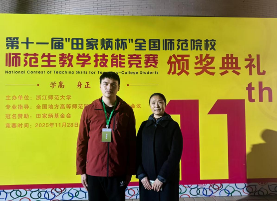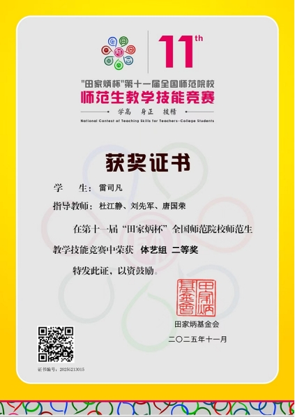 第十一届“田家炳杯”全国师范院校师范生教学技能竞赛于浙江金华圆满收官,体育学院2022级体育教育专业雷司凡同学凭借扎实的教学功底、创新的教学设计和沉稳的临场表现,从全国众多参赛选手中脱颖而出,荣获初中体艺组二等奖,为学院赢得国家级赛事荣誉。